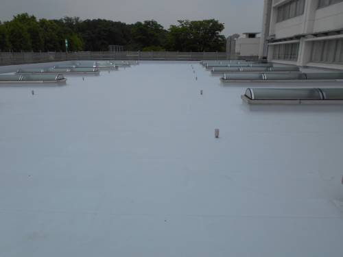 企業様の社屋に対して、塩ビシート防水による機械的固定工法であるIW自動加熱システムを採用して防水工事いたしました